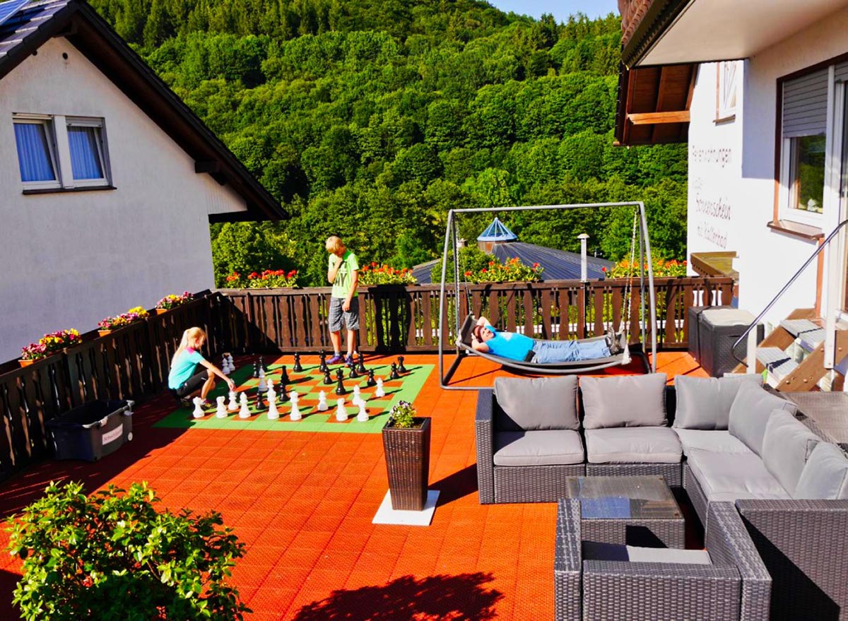 Auf unserer großen Außenterrasse wurde für die ruhigen Minuten eine Longe, eine Relax-Schaukelliege und ein Außenschach installiert.